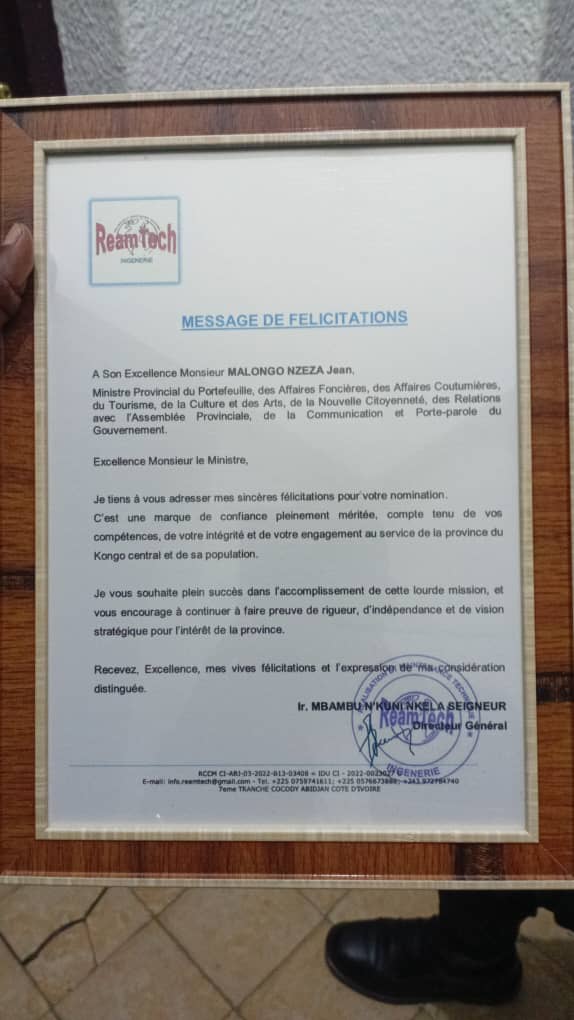 Dans ce document officiel, signé par son directeur général, Ream Tech a salué la nomination de Jean Malongo, la qualifiant de choix judicieux au regard de ses compétences, de son intégrité et de son attachement au développement de la province.
