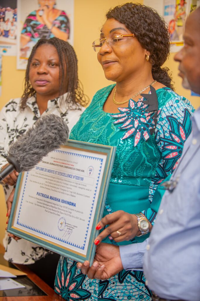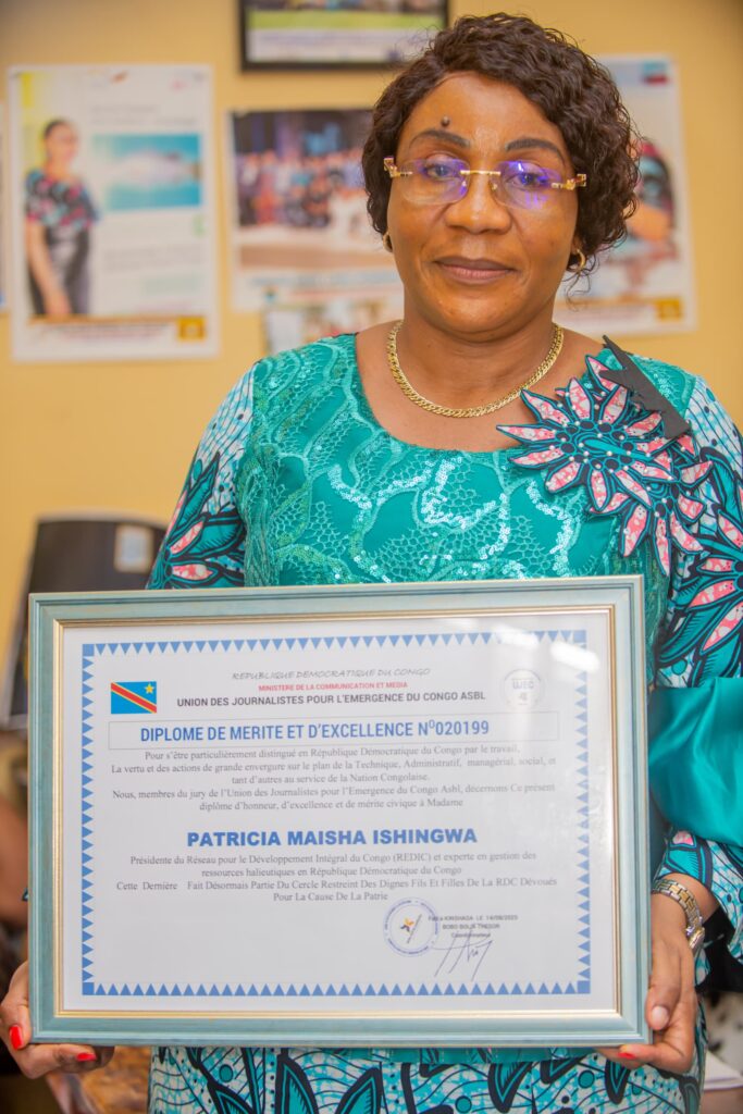 C’est dans une ambiance empreinte de joie et de reconnaissance que Madame Patricia Maisha, Présidente de REDIC-AWFISHNET-RDC, a été récompensée par un diplôme de mérite et un prix patriotique, en hommage à son engagement remarquable dans le secteur de la pêche et de l’aquaculture en République Démocratique du Congo.
